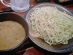 早朝に降っていた雨、出勤時にはピタっと止む。日中の暑かったこと!ビル冷房28℃に設定しているので、部屋の中で団扇をあおぎっぱなしであった。“花金”の夜、三枝子さんを北千住「丸井」1階フードコートで待っているときに、空腹我慢できずに「はなまるうどん」でかけうどん(小)&さつまいも天、合計200円。やっと到着した三枝子さん共々、丸井ビル9階食堂街を彷徨い、「麺屋 空海」へ。おつまみ3点セット(メンマ、チャーシュー、味付け玉子)、つけ麺(中=麺2玉分)=写真、餃子など、ビールジョッキ2杯。減量の“強敵・炭水化物”をいっぱい摂取した夜となった。帰宅して350ml缶1つ。