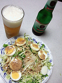八が崎室内テニス7時から8時50分、コーヒータイムを経て「健美の湯」、雨と風の露天風呂。帰宅して餃子ライスで350ml缶3つ。ピアノと歌の最後の特訓。いまさらジタバタしても、と半ば諦めの心境・・。すっきりした歌声が出せない。もっとも普段からボイス・トレーニングなんてやっていないのだから無理だって!?生キャベツと酢みそ、コーンとわかめのサラダ、うなぎご飯、ミョウガとねぎの玉子とじスープ。350ml缶&タカラ