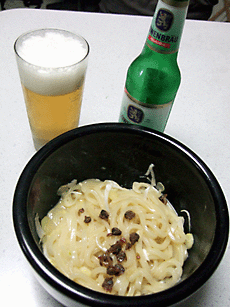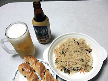 冷凍の「ケンミン・焼ビーフン」をレンジでチンしてさらに(おいしくするために)フライパンで少し炒める。ノンアルコールビールは「アサヒ・ポイントゼロ」334ml(アルコール分0.00%)。微かに甘味。「不味い」って騒ぐほどではないが“いまいち”ピンと来ない。何回も使える「リターナブルびん」で、ゴミとして捨てずに買った店に返却するようにラベルに書いてある。面倒じゃのう。