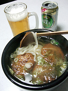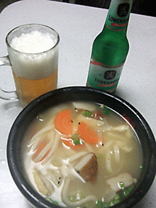 今週2回目の“休肝”日。夕食は「加ト吉冷凍さぬきうどん」をつかって「けんちん風うどん」とする。さつま揚げ、玉葱、人参。独レーベンブロイ・アルコールフリー(アルコール分0.5%未満)330ml=写真。