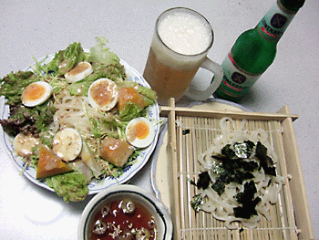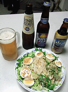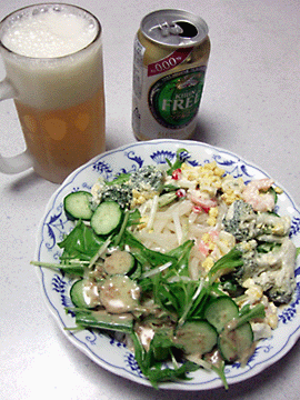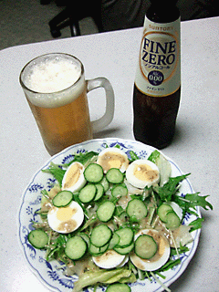 第4月曜日は『休館日』だが、第4月曜日が祭日の場合はその翌日が休館日となる。従って本日は栗が沢コートを使えないので早朝テニスはお休み。「ビッグコミック・オリジナル」がふやけるほど長湯した朝風呂後は75.4kg体脂肪率21。会社へ・・。今週1回目の“休肝”日。夕食は「亀城庵さぬきうどん・本膳」並切麺(200g)を茹でて、とことん飽きない「ごまドレッシングのサラダうどん」=写真。ノンアルコールビールはサントリー「ファインゼロ」334ml瓶((アルコール分0.00%)。う〜む、やっぱりどこかツンと来る薬臭さが気になる。アルコール分0.00%の国産ノンアルコールビール新製品を飲み較べてきたが、サントリーが一番不味い。好みでは1位サッポロ、2位麒麟、3位アサヒといった順位付けだが、別格として、独レーベンブロイ・アルコールフリー(アルコール分0.5%未満)330mlがこくがあって一番美味い。