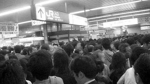 朝7時現在、台風18号は東海地方を北上中で関東直撃はなくなったようだ。しかし千代田線は運転本数を減らして運行中とのこと。会社の『生活習慣病検診』を8時45分から予約しているので、やれやれ、どうやら腹ぺこで満員電車に乗る羽目に・・・、と思っていたらとんでもないことに!?7時50分に松戸駅に着いたらホームからコンコースまで人、人、人であふれている(=あえてドキュメントタッチで白黒写真で、画像は1部加工処理)。台風による強風で金町―松戸間(江戸川鉄橋がある)の運転見合わせとのことだったが、そのうちに常磐線の快速と緩行線の両方とも運転見合わせが決定。再開見通しもたたず。新京成はまだ動いているので、強風下いったん帰宅して待機することに・・。13時30分ごろTVのテロップで常磐線の運転再開を知って、結局、会社に着いたのが15時ごろ。不可抗力ということで『生活習慣病検診』は明日の同時間に延期してもらった。
