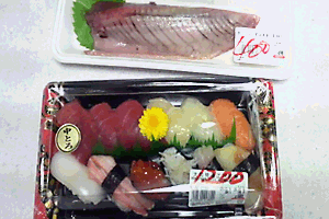 会社の『生活習慣病検診』を8時45分から・・。公式記録は体重76.0kg体脂肪率18.6、胴回り89cmであった!夜、三枝子さん帰り遅いとのことで、松戸駅ビルにて「握り寿司&カツオ刺身」をセットで1000円でゲット=写真。ロング缶2つ&タカラ