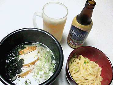 夜半にけっこう雨が降ったようだ・・。地面が濡れていてちょっと逡巡したぶんだけ遅くなった。早朝テニス6時40分から1時間。今週2回目の“休肝”日。りんご酢の水割り飲んで渋々、会社へ。夕刻、笹やんのピアノレッスン終えて、さて夕食をどうするか。北千住の「はなまるうどん」が第一候補。しかし2つ手前の西日暮里で偶然座れたので北千住下車はパスして松戸まで乗って行く事に。駅前でラーメン店を探してみるがどこもいまいち食指が動かず。帰宅して「亀城庵さぬきうどん・本膳」並切麺150gを茹でて「釜玉うどん」、今回しじみ佃煮をアクセントに加えてみる。独レーベンブロイ・アルコールフリー(アルコール分0.5%未満)330ml=写真。