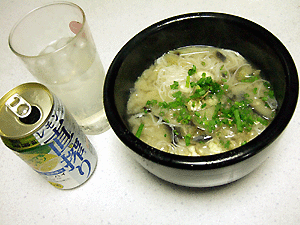 カンチューハイ「直搾り」レモン350ml缶。ご飯少々、永谷園・松茸のお吸い物。