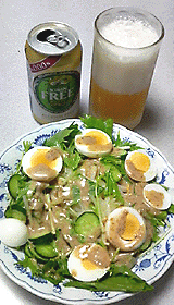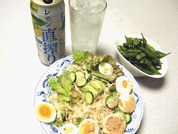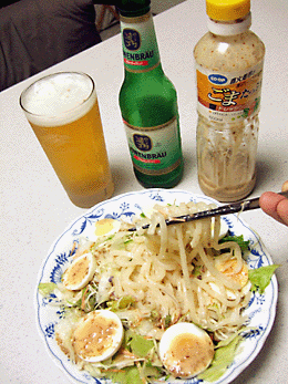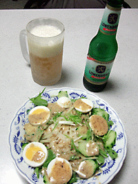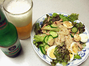朝、栗が沢コートでテニス。蒸し暑くて大汗。しかし梅酒で“気合い”も入れられず、「ハチミツりんご酢ダイエット」水割り飲んで渋々、会社へ・・。というのも、今週こそ『“休肝”日を3日』とカミさんに宣言(7月31日の項参照)したわけで、まず今日、明日と2日続けて実行することに!?夜は「亀城庵さぬきうどん・本膳」並切麺180g、サニーレタス&キュウリ&焼豚&ゆで卵、絶対に飽きない、うどん“ムチムチ”の「ごまドレッシングのサラダうどん」。独レーベンブロイ・アルコールフリー(アルコール分0.5%未満)330ml=写真。