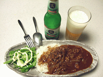 夕刻、今週2回目の“休肝”日、三枝子さん特製ハヤシライス、独レーベンブロイ・アルコールフリー(アルコール分0.5%未満)330ml=写真。
