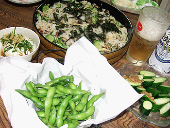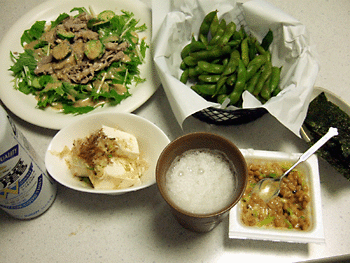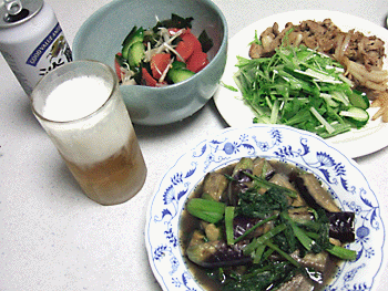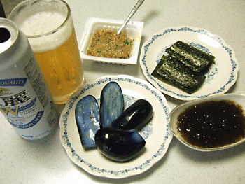 朝、栗が沢コート7時45分からテニス11時まで。「柏湯元」で汗を流していったん帰宅。玄関ドアの塗装工事が進行中でペンキが乾くまでドアを閉められない(このために休日にしたのだ)。洗濯したり、ピアノ練習したり、近所を軽くジョギングしてシャワー浴びて74.8kg。夕刻、写真のごとく“独り宴会”に突入。いつものように納豆&海苔、もずく酢、それに今朝、テニスコートでいただいた『イナガキ家の水なす』、しゃきっと冷たい浅漬け、美味。350ml缶&ロング缶&タカラ