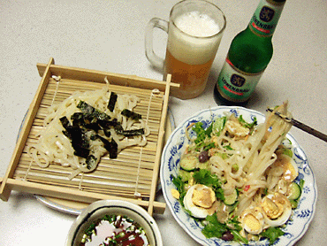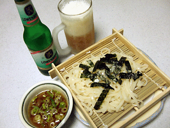 早朝テニス6時30分から7時30分まで。蒸し暑くて“超”大汗。ミツカン「カラダ酢レモン」の水割り飲んで会社へ・・。今週1回目の“休肝”日、夕食は「亀城庵さぬきうどん・本膳」並切麺200gで、絶対に飽きない「ごまドレッシングのサラダうどん」と「冷やしざるうどん」。独レーベンブロイ・アルコールフリー(アルコール分0.5%未満)330mlを2本=写真。