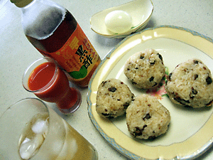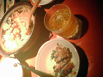 「朝6時には激しく雨が・・」との天気予報をすっかり信じ込んでいたら、なんちゅうこっちゃ、降っていませんがな。カフェ・オレでケーキいただきつつ、早朝テニスに今から行こうか?それとも軽くジョギングするか?迷っているうちに霧雨が・・・。朝食はおにぎり2個、ゆで卵、「梅はちみつ黒酢」の水割り、野菜ジュース=写真左。三枝子さんの甥っこ(と言っても既に44歳だが)・ジュン君が静岡から出張上京、三枝子さん主宰(要するに“勘定持ち”ということ)で一献。池袋の歓楽街を適当に歩いていたら10%割引券を配っていた「夕焼け小焼け」だったっけ?ま、その店でジョッキ(グラスビールだったが)2人で10杯(三枝子さんはウーロン茶)、なんとかサラダ、なんとかなんとか、などで適当に盛り上がる。帰宅23時過ぎ・・・。写真右は“なんとかなんとか”の土鍋ご飯とカクテル「ゴッドファーザー」。つまり、要するに、今日の“休肝”日は、なかったことに!?不可抗力により“自然消滅”です。