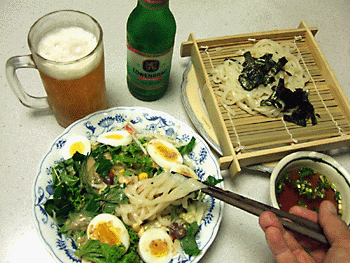 朝6時30分からテニス1時間。今朝も蒸し暑くて大汗。さて今週2回目の“休肝”日。笹やんのピアノレッスン終えて直帰。ミョーガとネギのつゆ、ソーメン「揖保の糸」2輪&ウリ鉄砲漬け、独レーベンブロイ・アルコールフリー(アルコール分0.5%未満)330ml=写真。