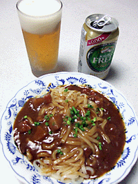 夕刻、笹やんのピアノレッスンはお休み。帰宅して「亀城庵さぬきうどん・本膳」並切麺150gと「ザ・プライス」で買った「ビーフカレー中辛(87円)」のコラボレーション(合作)。茹でたうどんを水洗いするのではなく“釜あげ”でいただくのが我輩流こだわりの「カレーうどん」=写真。うどんのモチモチ感はサイコ−。カレーの味はイマイチ。「キリンフリー