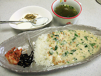 朝6時から早朝テニス7時30分まで。「とろとろ丼」と昆布スープ、キウイ&ヨーグルト&きな粉の朝食=写真。渋々、会社へ。昼は鶏軟骨団子と温野菜、ご飯150gのヘルシー定食(400円)と春雨サラダ(150円)。夕食は納豆&海苔、先般お土産で買ってきた宇都宮餃子をメインにロング缶2つ&タカラ