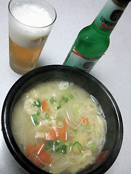 夜半からの雨が止んでいる。早朝テニス6時30分から1時間、湿気のせいか、超大汗。ラケットのグリップが汗ですべる。されど一昨日の走り込みの成果か?フットワーク良く(試合に勝って)意気揚々とコートを去ったのであった。出勤途上、千代田線がダイヤ乱れ、30分遅れで会社へ。昼、社員食堂で「豚ヒレステーキ丼」、茶碗蒸し付きで700円。美味しそうなメニューだが、“たれ”が濃すぎた。だまされた。今週1回目の“休肝”日、夕食は「揖保の糸」そーめん2輪、玉葱、人参、油揚げ、和風だしなどで、我輩“お手製”の「にゅーめん」味噌仕立て。熱すぎて口の中をヤケドしたようだ・・。独レーベンブロイ・アルコールフリー(アルコール分0.5%未満)330ml=写真。