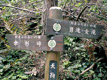 黒山鉱泉の駐車場(料金500円)に。但し、黒山鉱泉で温泉に入る(入湯料1000円)などしたら駐車代金は戻ってくる。黒山3滝とは、男滝、女滝、天狗滝の3滝をいう。渓谷美というか、紅葉の時期はいいだろうな。鉱泉で案内パンフをもらって、傘杉峠までハイキング。結構急な登りもあり、静かな山道、うぐいすの音(ね)が響く。約1時間で峠の車道に出る。