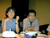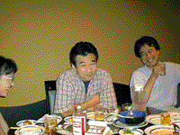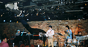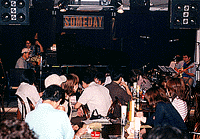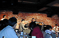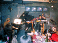 | 2002年11月16日(土)くもり、寒い・・ 赤坂「B flat」11時開場、11時15分第1部がスタート。30分休憩後、13時第2部スタート、その3番目に登場。♪♪シュビデュビ・ダバデュビィ♪ 我が演奏タイム終わり、ビールジョッキ2杯。15時35分第3部終了、「ドトールコーヒー」で休憩、16時30分「やるき茶屋」の打ち上げ会(左の写真はホッとしたところ?=佐野えっこ様の提供)に参加、19時30分、2次会に行くところで帰途につく。 |