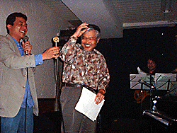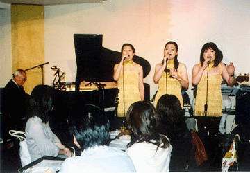 発表会レポート=2005.11.20 ポイントは1、2番を歌ったあと「中休み」で“ご期待にお応えした”アドリブの語りのところ。どのくらいの時間になるか見当もつかなかった自由時間(後から計算したらきっちり24小節あった)であったが、拍をとりながら喋るのも“慣れてきた”かな!? 数日前にわがピアノのホームページを発見されたと言う柳原かおりさん(昨年と今年、2回参加)も、3部のトップで「TicoTico」をいいテンポで弾かれておりましたゾ。 テンポと言えば、今回、自分でカウントをとってイントロをやったのですが、予想外の早いテンポになって、バンドの演奏にせっつかれるように、まるで追われているがごとく曲が進行して、フランス語の歌詞がぶっ飛んでしまうような珍事が起こりましたが、なぜあのようになったか、事の次第は今度のレッスンのときに笹やんに聞いてみましょう。なにせ本番一発勝負、リハーサルなし!ですからなかなか大変なんざ〜んす。 |