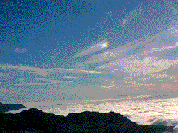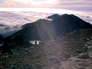 イワヒバリと雲海(左下)イワヒバリがシルエットになっているのが分かるかな?雲海がかかっているのは大日岳。なぜか山で水兵さんが写真を撮っている!(右下)