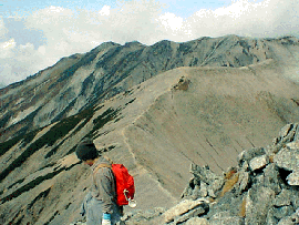 雄山から大汝山(立山3山の最高峰3015メートル)を経て、真砂岳、富士ノ折立、別山へ。この稜線(写真下)を歩きたい!と三枝子さんが今回の山行を企画したのであった。