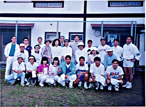 早朝テニスクラブと流通経済大学テニス部との対抗戦も、鴇田先生のイニシアティブでスタートし、年々盛り上がってきた企画だ。みんなで竜ヶ崎に行くのは楽しみだった(写真下は91年9月、試合前のあいさつで勢揃い)。