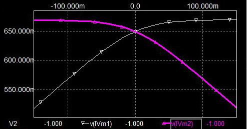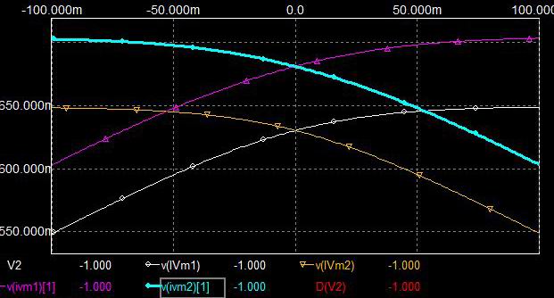 上図はテイル電流が1mAの時と10mAの時のQ1、Q2のVbeの関係のグラフですが当然BIASが変化して動作点は変化していますがカーブの変化は同じ形になっています。 これはすなわちtransistor、Diodeを差動の負荷にした場合、AUDIO信号の変化は同じレベルになることを示しているわけです。(これによりVCA化をさける)