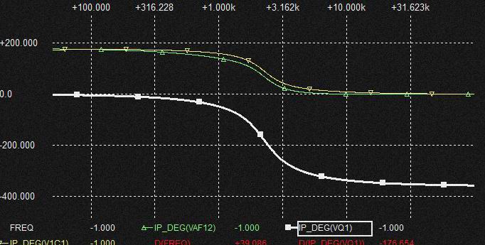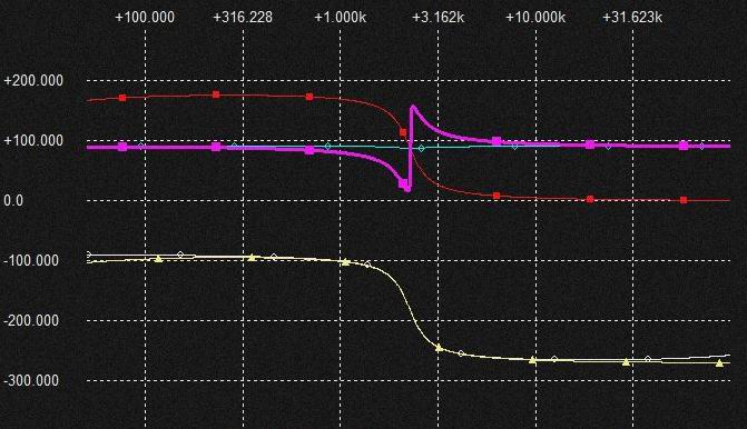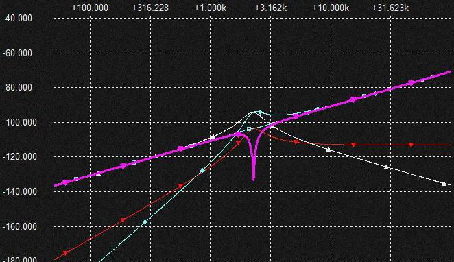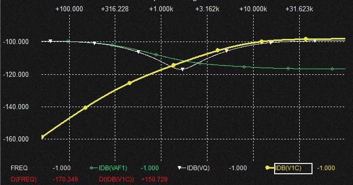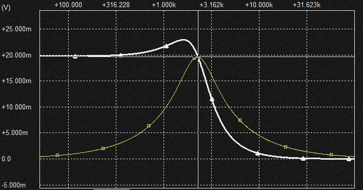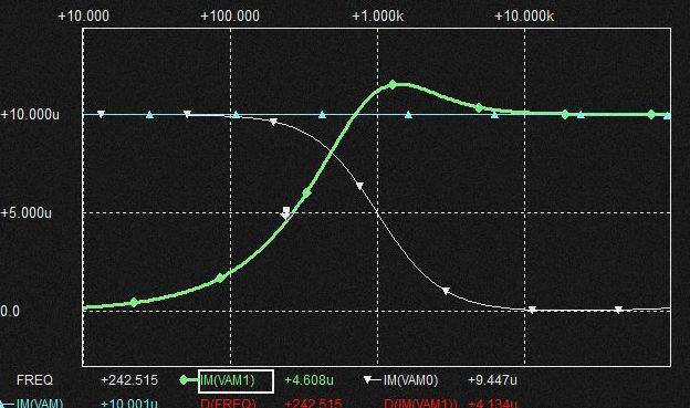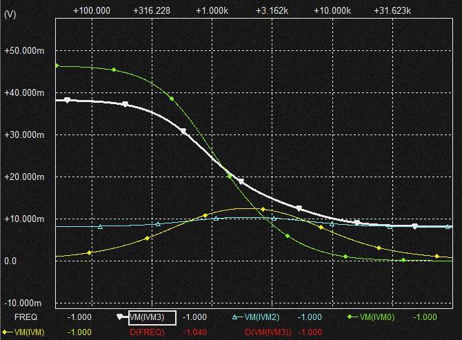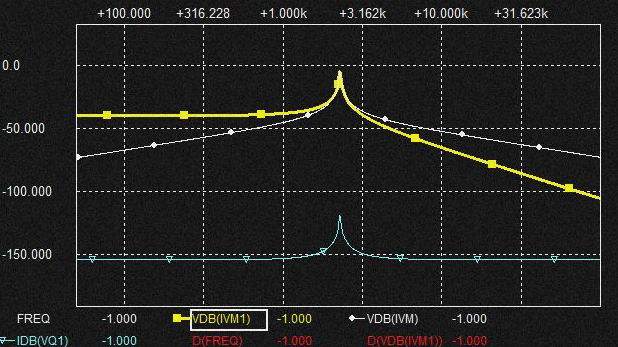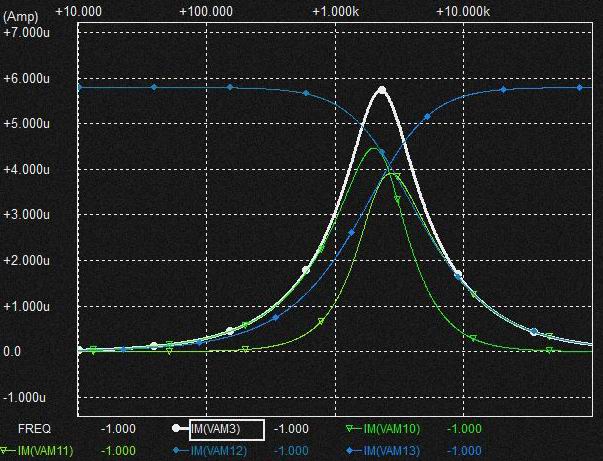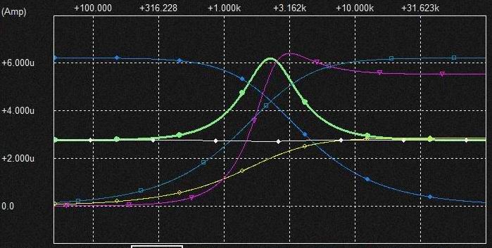 0.02uFの Cap.を流れる電流は上記と同様棚部分がとれてLPFからHPFに変化しており上図ではわかりにくいですがSlopeは2次特性になるのでCap.電圧はQの低いBPF特性となります。