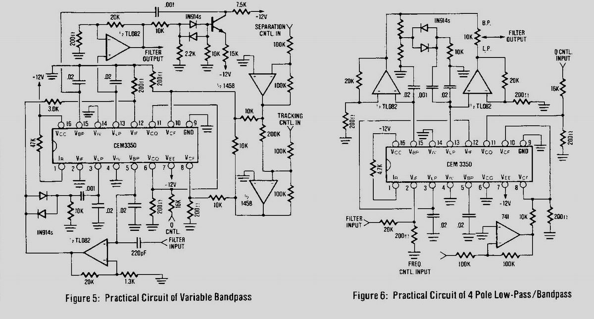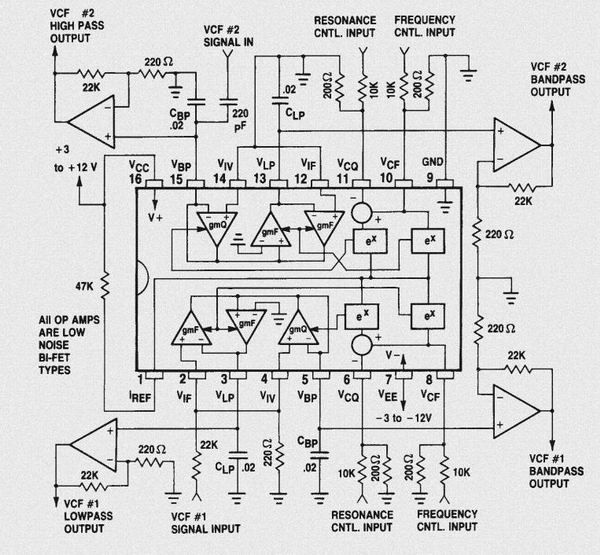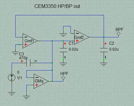本質的にはOP AMPの SVFと同じ構造ですが、OP AMPの方は入力段の信号MIXに際してSIG INのFc付近での GAIN低下をBPF出力を逆相で戻しているのに対してCEM3350では積分器のBPF特性発生直前の部分で行うという違いがあります。