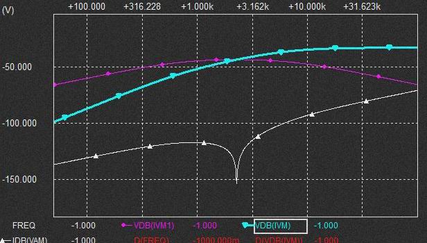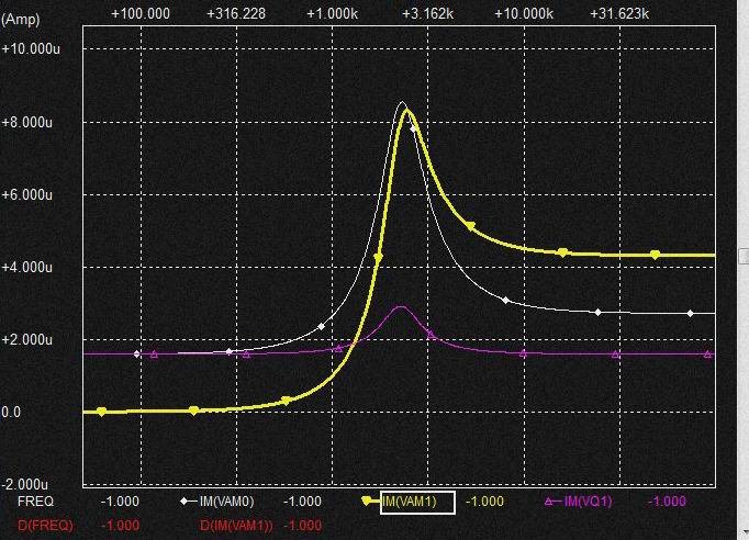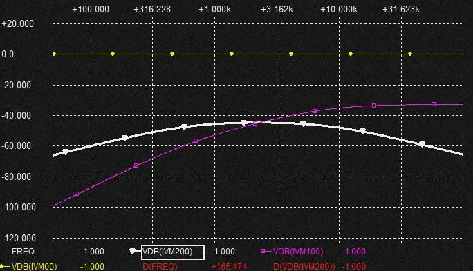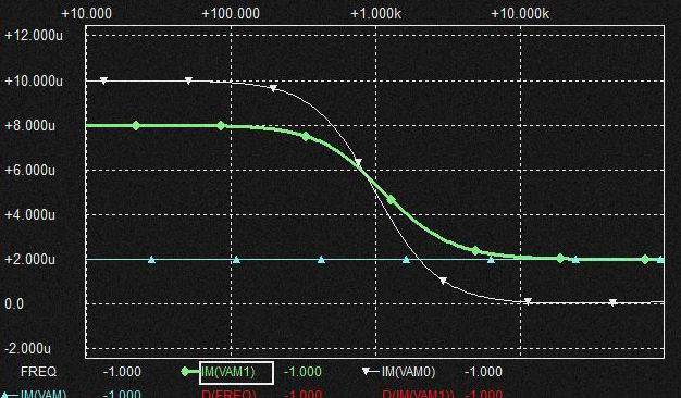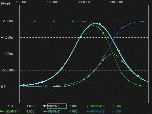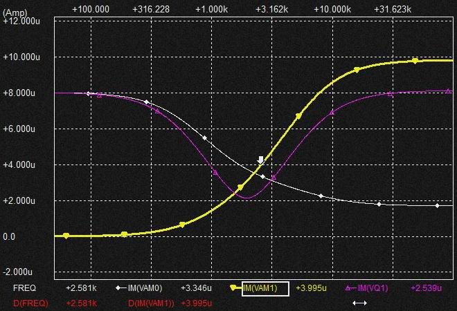 これはなんだろうと考えてみると電流MIX時のVCRを流れる電流に消費されるという動きをします。 棚部分が十分なくらいVCRを流れる電流が小さければ VCR側に電流が消費されてもQの高いBPF電圧を発生させるためのGmF1からの0.02uFへの定電流は確保されていることになるとも考えられそうです。 VCRのRが小さくなれば棚部分だけではVCRに流れる電流分を支えられないので特性が変化するしCap.に流れる分流も減少する?。