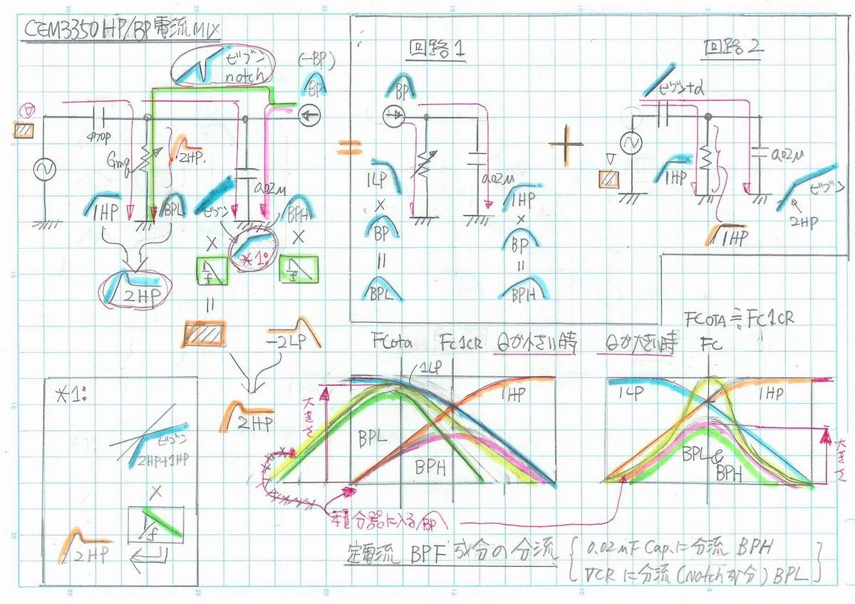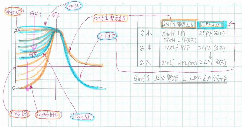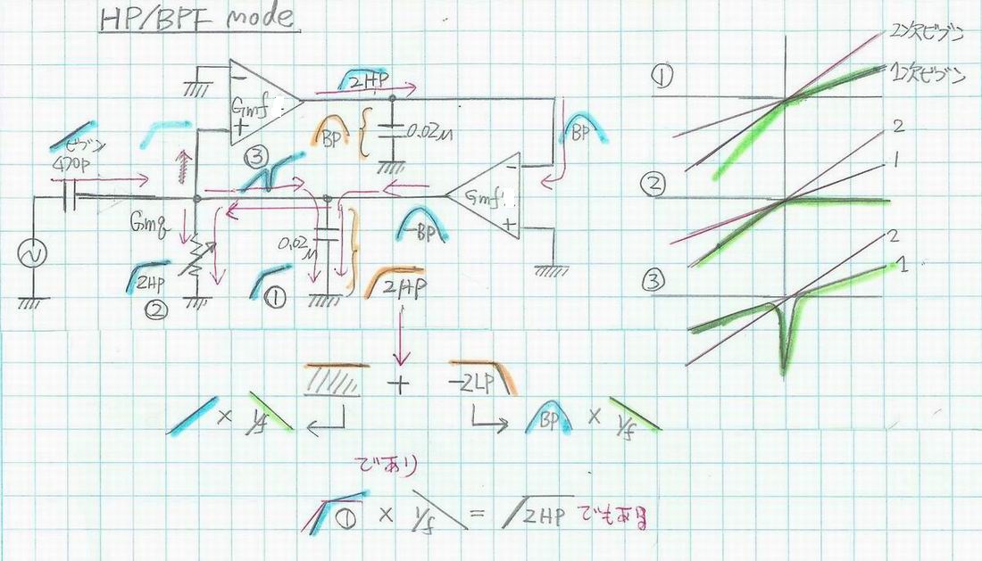 1:GmF1の定電流源はVCRと0.02uFのCap.により構成される定電流入力型の1次Filterに対して R(LPF特性)とCap.(HPF特性)のインピーダンス比で分流。