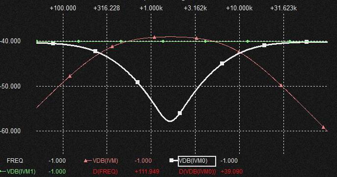 Gmqは上図のようにVCR動作ですので可変抵抗と等価です。 実際この回路の Gmq部分を抵抗に変えても同様の特性。 この抵抗値が大きい方がnotch filter効果は弱く小さい方が大きいのですが大きくするとFc位置でnotch特性でなくピークができますがBPF特性ではありません。 シミュレーションでは3KΩくらいでこのnotch特性が平坦になりました。 それより大きいとFcでピーク。