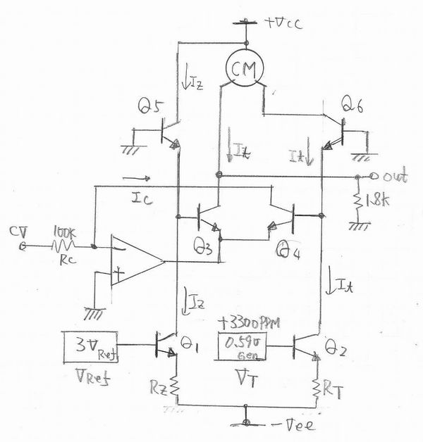 CV inの部分はantilog ampでいうところの Linear IN部分なのでOPAMPとQ4でLog Ampが形成される形になりQ3ほそれに対してEXPOなのでantilogです。結果Q3のIcはCV inに対してLinear出力です。