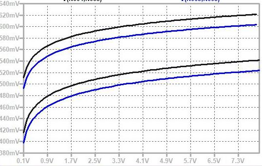 となり通常のCVの変化に際しても儼be1の変化がエミッタフォロワの出力にも影響はしてはいますが 儼be1/儼ref は上図のVref=2..3V付近では1%くらいになっており儼refの変化に対して儼be1=儼be2の変化は大変小さいのでCV入力からすればCVの変化はNPNの B-E間にほぼリニアに伝わるとみなせる。