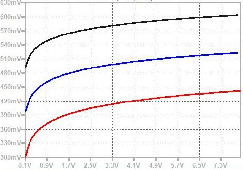 図のようにエミッタフォロワの動作点が高ければVRはほぼリニアに見えますが完全にリニアではなくまたNPNのVbeも変化無しに見えますが完全に変化なしではなく LOG特性ですが変化が止まって見える領域だということです。 すなわち動作点が高いのでVbeのほんのわずかな変化でIc1をリニアに近い上昇電流を確保できると言うこと。 ここらへんが analog 回路というか Tr.の VbeとIc間のEXPO特性とエミッタフォロワの負帰還のマジック的な部分のなせる業でしょう。