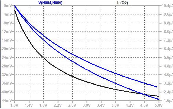 上図においてはシミュレータ上ではVcv=-0.007Vの時(*1)でIc1とIc2の変化は同じになりますがVcvがそれより大きいと Ic2>Ic1となりそれより小さいとIc1> Ic2になり IC1とIC2は共にリニアな変化ですが倍率が変わります。これは単純に両者の動作点が異なれば同じ儼beの変化でも両者の僮cは異なるということです。