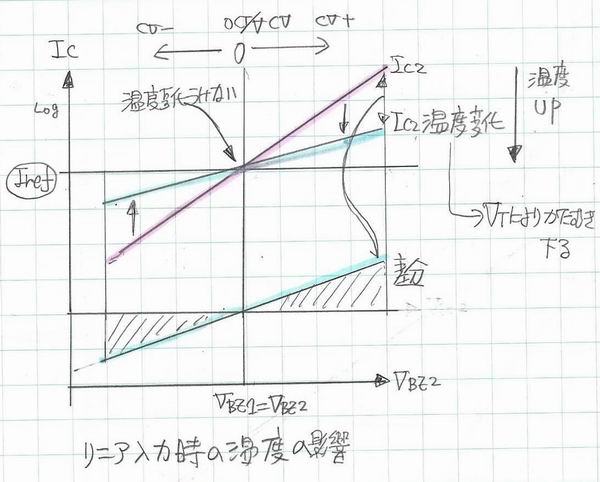 温度変化に対してLOGスケール上のIc-Vbe曲線は単にX軸に対して左右に動くことですから、このIcが変動しないということはなにもしない場合の温度上昇に対応した Ic-Vbe曲線を