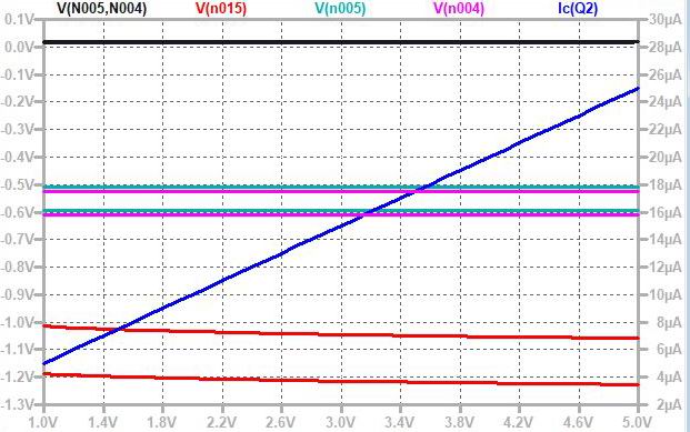 ポイントとしてはVcvが固定されて動かないすなわちPNPのベース電位が固定なのでVrefを動かした時の変化がエミッタに現れます。 これはPNPの儼beの変化分だけでIcの変化による抵抗の電圧降下の増加分に対してははほぼVrefの変化と同じだが儼be1だけ小さくなります。