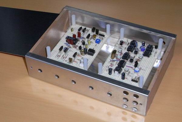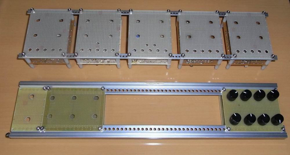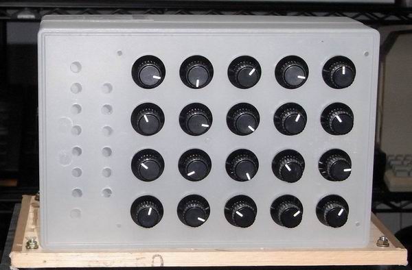 上の写真は doepferのA110VCOの回路をコピーしたものです。 Volumeは3段、jackは2段で SWが1段です。 jackは余裕があるようにすきまをあけました。 目盛り板は古くから秋葉に売っていてよく昔のラジオなどの製作記事で使われており当時は格好の悪い古びたデザインに見え好きではなかったです。 90年代に秋葉のヒロセ無線が閉店した際に特価で10個100円で売っていたので何かに使えないかと多目に購入したものです。 普通に買うと1個100円以上しますが安価だったので気軽に使えます。 つまみとのデザインが合えばこのようになにも化粧していないパネルでもそこそこ見られるパネルになります。 またこのトレイをサブパネルとして後日、化粧板をつけてもいいでしょう。 トレイの筐体へのマウントもL型のアルミアングルで連結できます。 ダイソーの商品は移り変わりが速いので売れないものはすぐディスコンになってしまい、上記トレイもすぐになくなりましたが(2005年で消滅)それを見越していくつも保有しているので10module程度のmodularならこれで構成できます。 同じころに穴のいっぱいあいたアルミのブックスタンドと言うものもダイソーで売られていました。 これも同じくsynth module等には有用に思えます。 ダイソーといえば 桐の枡も色々に使えて有用なのですが最近見かけません。 細い木枠を追加してスラントスタイルなパネルにしてみました。 これを利用して小型のsynthを作ってみたいものです。 と思いながら早、10数年たってしまいました。