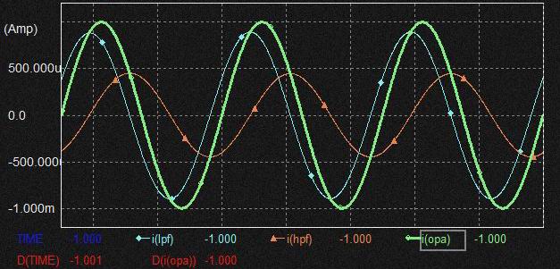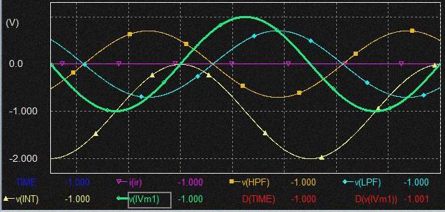(-)端子での電圧すなわちLPF、HPFの電圧は両者逆相でレベルは同じで電圧に関してはバーチャルショートの維持、電流MIXにおいての負帰還作用は入力ループ側の逆特性のMIXで定電流、すなわち1を保持。 回路の表向きで見られる電流変化は Vin/Rinで単に抵抗を流れる正弦波定電流でそれが積分されることですがその実態は上図のような入力ループ側と出力ループ側の複雑な電流MIXの結果だということがわかります。 実際は負帰還ループによって OP AMPの (+)端子と(-)端子がほぼおなじ電圧になるまで サーボ機構が働き同じになると平衡する反応ですが。