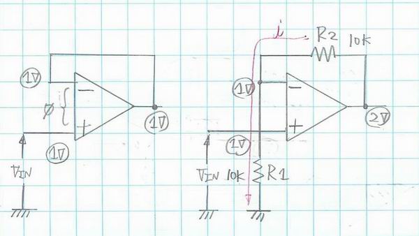 例としてもっとも単純なものが 非反転増幅器のボルテージフォロワーです。 この場合印加電圧は(+)端子に直接印加し、出力を100% (-)端子に負帰還した形で上記の説明通りの反応となります。 帰還経路に何も入っていない状態。 電圧が印加されれば上記のように負帰還の特性によりマイナス端子とプラス端子には真の入力電圧という電位差が発生しその電位差分出力電圧は低い。 すなわちマイナス端子の電圧が低く、系はそれでバランスしている。 これは両端子の電位差を裸GAINで増幅した結果である。 つまり厳密には両端子間は同じ電位にならないが非常に小さい値なので無視して考えてよい。 これを理解していなで本当に0だと思ってしまうとなんだか動作がよくわからない回路になってしまいます。 (+)、(-)の2端子間には必ず微量ですが真の印加電圧が印加されているということが前提です。 負帰還作用のポイントとしては帰還ループ内になにが入っていても(どのような変化があっても)入力の両端子がほぼ同じ電圧になるように制御されるサーボ作用が本質だということ。 増幅と言うことばとは違和感があるが。 これは増幅器の裸のGAINが非常に大きいことがなせる技。 すなわち本来の増幅度の余裕を残した上でみかけは増幅度の小さい増幅器を構成しているので変化があっても条件が維持されるということか。 右の図は2倍の非反転増幅でありこの場合、抵抗により出力を分圧したものがマイナス端子に印加されるので負帰還が1/2に弱まった状態なので出力電圧はボルテージフォロワの2倍になる。 負帰還が弱まるから(+)、(-)の2端子間に加わる真の印加電圧はボルテージフォロワーの2倍になることによって裸GAINと出力の対応が成り立つ。マクロ的にはこの場合も(+)、(-)の電位差は0と考える。 分圧抵抗は直列回路なので R1、R2を流れる電流値は同じであって(+)、(-)の電位差が0になるようにこの電流が流れることによってバーチャルショートが成り立つのだからVin /R1で発生する電流は定電流源と同じだ。 VinとR1が変化しなければ R2を変化させてもこの定電流値は変化しないことがOP AMPの負帰還の本質。 負帰還が弱くなって真の印加電圧が2倍になっても裸GAINは変わらないのだから抵抗値が2倍になっても抵抗を流れる電流値は 変わらないということ。