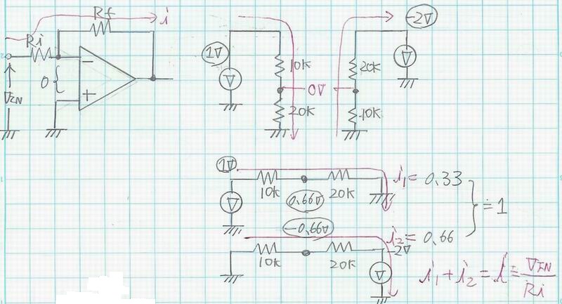 次に反転増幅器を考える。 これは非反転増幅器よりむずかしい。 すなわち印加電圧が直接(-)端子につながっていないし、出力を負帰還させる先が入力と同じ (-)端子であるので複雑。 印加電圧を直接(-)端子に印加できないのは出力も同じ端子に戻すから。 入力電圧はマイナス入力なので出力はマイナスになりそれをマイナス端子に帰還するので出力の帰還は入力と反転関係である。 入力と出力がマイナス端子1点に重畳されるので マイナス端子に印加される電圧は入力側からみた回路と出力側から見た回路の重ね合わせである。