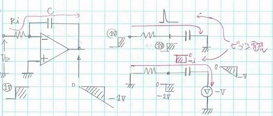 この場合の動作は、OP AMPの内部の動作をこのように考えなくとも単にOP AMPの外の回路の振る舞いから出力電圧の変化を考えた場合と同じになる。 すなわち 外から見れば定電流源が Cに単に作用しているのと等価になる。( 但し(-)端子がバーチャルショートなのでcapacitorの右端子はGNDレベルではなく上図であれば(-)端子がGNDレベル.) 内部動作的には実際はOP AMPが一定電流を常に吸い込んでいる状態。 こうしないと 上記のように - 端子を0に保てなくなるのだから。 定電流源の元はVin / RではなくOP AMPの作用であるということ。