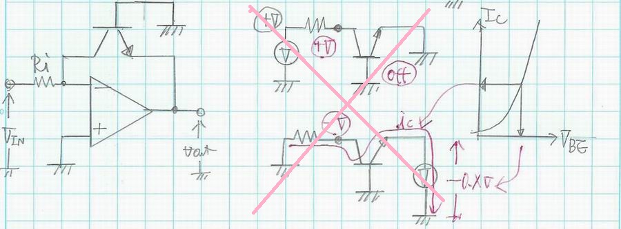 といった負帰還ループの反応が起こりここでもOP AMPの 2端子間がほぼ0Vになることで状態が平衡する。 出力電圧はマイナスだがその値はVin/Rinで規定される電流を C-E間に流した結果のVbeの値すなわち Ic=Is{exp(q*Vbe/kT)-1} を反映した値となる。