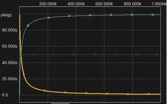 Rinを10Kとして Rfを1から1Mまで可変した場合の入力、出力電流の変化を以下に示す。