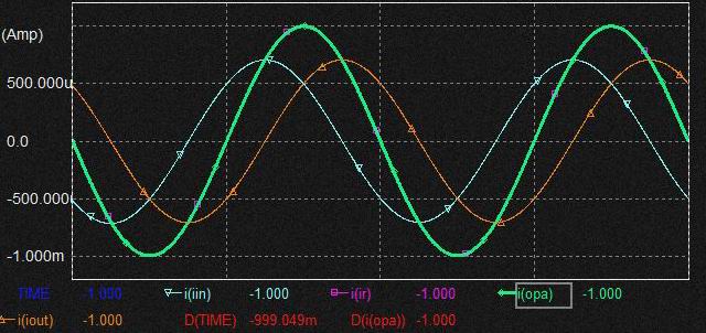 CR回路においても当然、Rinに流れる電流は入力ループと出力ループの和になっています。 正弦波を印加すると Vin/Riで発生する電流は印加電圧と位相が同じ電流になりこの電流値を1とすれば、Fcの周波数においては入力ループ側に流れる電流は振幅が0.7で位相が電圧波形に対して45度進んだ正弦波、出力ループ側は同じ CR直列接続なので振幅0.7で本来なら同じ位相の波形と言いたいところですが出力電圧は位相反転してさらに90度位相がずれた電圧なので結局、電圧波形に対して位相が45度送れた正弦波なので加算すると印加電圧と位相が同じ 振幅1すなわちVin/Rinで求まる電流振幅の正弦波とうまい具合になります。