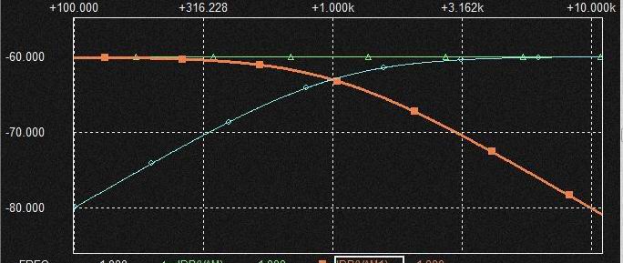 積分カーブは2KHzで-6dBなので印加信号の1/2。 出力ループ(LPF特性)と積分カーブとの差は約-1dBなので約0.9倍。 -0.9*0.5=0.45。 入力ループ(HPF特性)も入力信号との差は約-1dBなので0.9倍。 上記のグラフはそのようになっています。