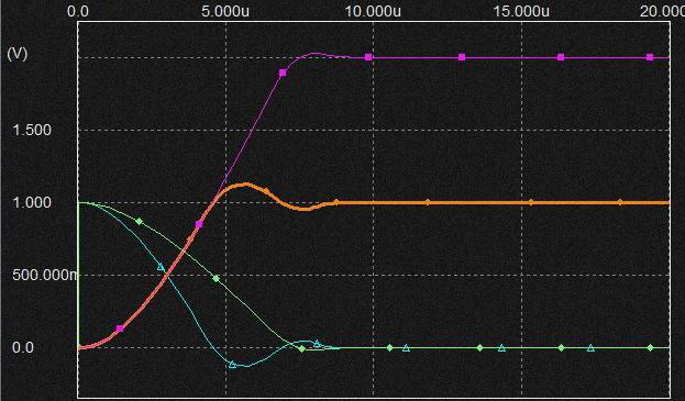 OUTPUT=0時、(+)端子に印加される電圧は同じなので Vsaも同じだが最終的には0に近づいていく。 出力電圧=2Vの場合の方が負帰還が弱いのでVsaは大きい。 出力が2倍の方が安定化するのに時間がかかる。(Through Rateが存在する) また負帰還が強いほうがover/under shootが大きい)