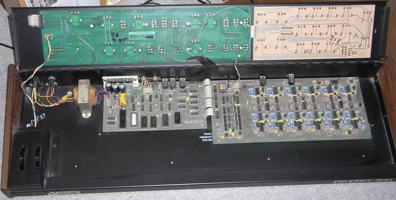 prophet5のLowcost版としての製品でもあるため基本構成はprophet5と同じような構成で1voiceあたり2っのCEM3340VCO、VCFとVCAさらにVCO MIX用のVCAを1ICに統合したCEM3372という構成でEG、LFO等のmodulator はSOFT制御にすることによってprophet5よりかなり簡略化されています。 制御系のCPUまわりはprophet5と大きくは変わってはいません。