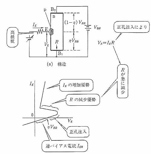 このためN型半導体内の E-B1間電位は下がり、diodeはますます順バイアスされ電流が増加するのでこの区間は負性抵抗となるというわけです。 電流がさらに増すと電流による電圧降下の方が優勢になり正抵抗となります。 ということらしいのですがこれは半導体というかPN junctionの本質をついた作用を利用しているわけです。 すなわち通常の抵抗体は電流の元となる電子の密度が電流が流れている時もいない時も電流値で変化しないわけですが、PN junctionにおいては 順バイアスとなる印加電圧は障壁電位を緩和させ、それによって電流の担い手である少数キャリアが増加、その増加 つまり担い手の増加が電流を増加つまりは抵抗値を下げる元であるわけです。