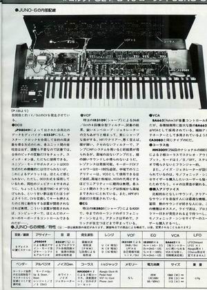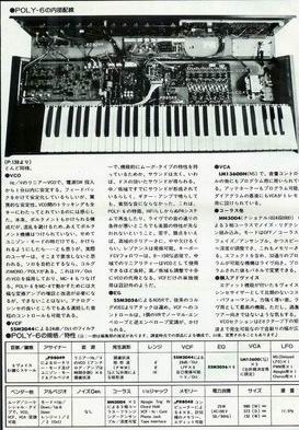 この特集はこの時期としてはめずらしい久々にかつての(1976から1978年ころの)ロッキンfの面目躍如といった内容でPOLY6とJUNO6の回路レベルでの比較や中身の写真もあります。