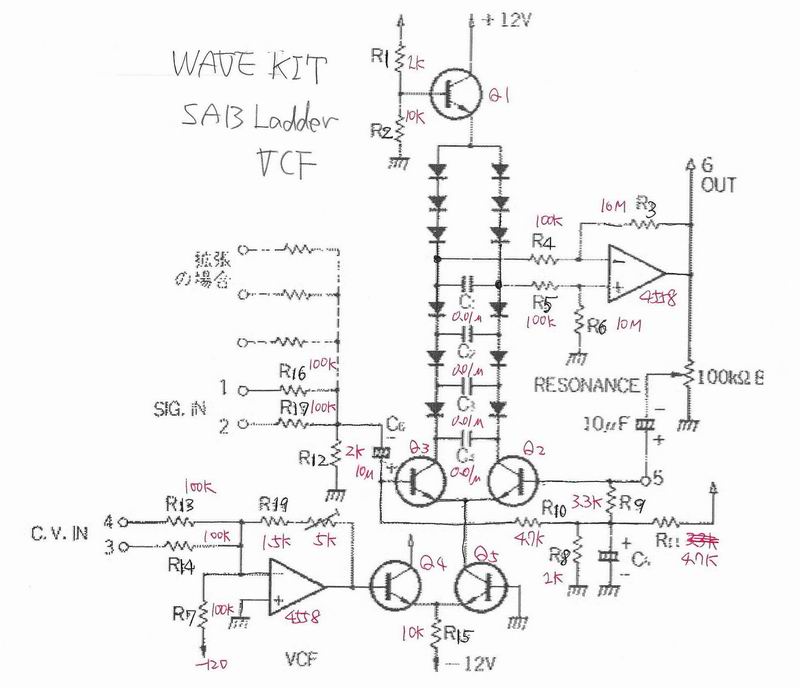 MS404のVCFでは差動OP AMPのゲインが15倍とこのVCFよりもかなり小さいこともあってresonance Volを発振寸前の状態に持っていっても負帰還による振幅の減少は1/2以下になっている。 このことからも負帰還タイプのVCFではladder以降の差動AMPのゲインを大きくしないでも発振できることが望ましいように思い、ます。 SA13のVCFにおいてはオリジナルではゲイン200倍である為 resonanceを上げた時の振幅の減少がとても大きく実用的ではない。 ゲイン200倍と言うのはWAVEKITのVCFが低域で発振しないことへの対策なのでしょうが弊害が大きいです。